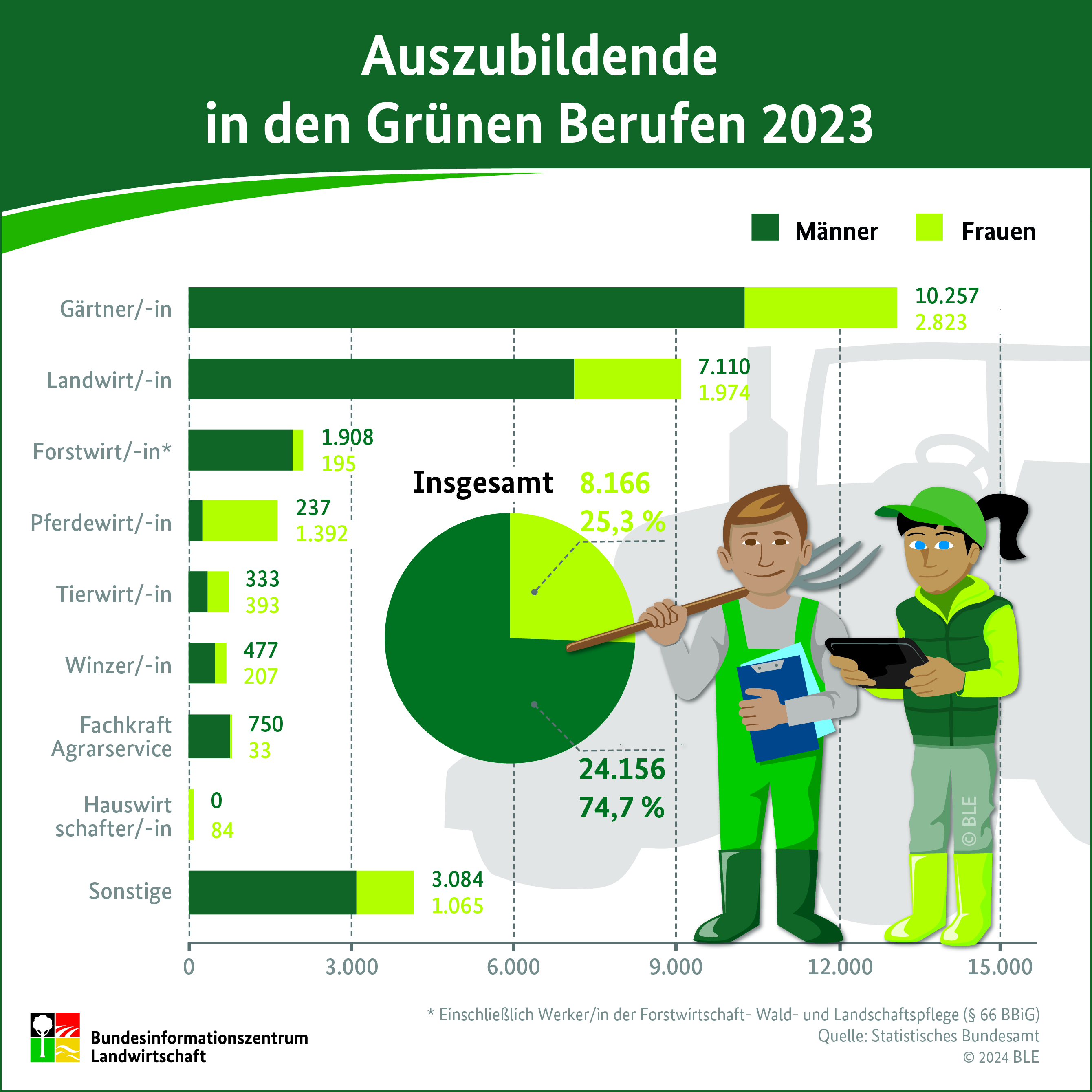 Im Jahr 2023 gab es insgesamt 32.322 Auszubildende in den Grünen Berufen – 633 Auszubildende weniger als 2022. Unter allen Auszubildenden in den Grünen Berufen lag der Frauenanteil bei 25,3 Prozent, damit stieg der Anteil gegenüber dem Vorjahr wieder geringfügig an.