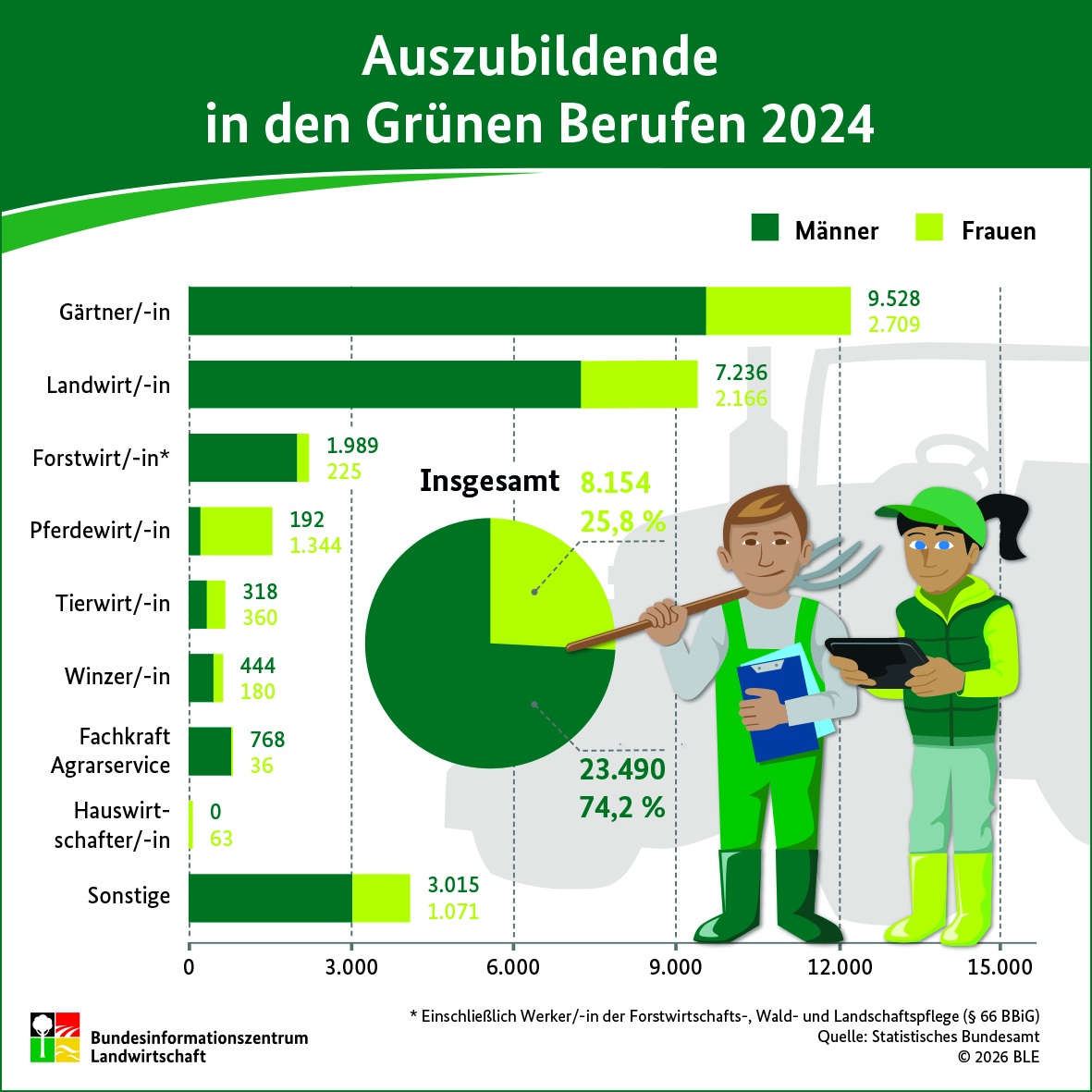 Im Jahr 2024 gab es insgesamt 31.644 Auszubildende in den Grünen Berufen – 678 Auszubildende weniger als 2023. Unter allen Auszubildenden in den Grünen Berufen lag der Frauenanteil bei 25,8 Prozent, damit stieg der Anteil gegenüber dem Vorjahr wieder geringfügig an.