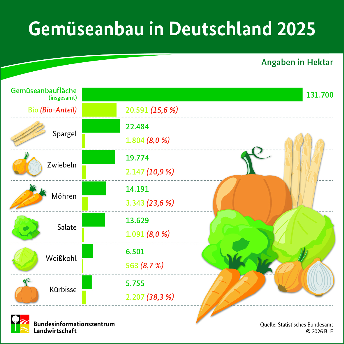 Trotz einer leicht rückläufigen Anbaufläche gegenüber dem Vorjahr bleibt Spargel insgesamt das flächenmäßig wichtigste Gemüse in Deutschland. Im ökologischen Landbau sind – bezogen auf die Anbaufläche – Möhren die wichtigste Anbaukultur. Was den Bio-Anteil betrifft, liegen Kürbisse ganz vorne. Mehr als 38 Prozent der gesamten Kürbisanbaufläche in Deutschland werden ökologisch bewirtschaftet.