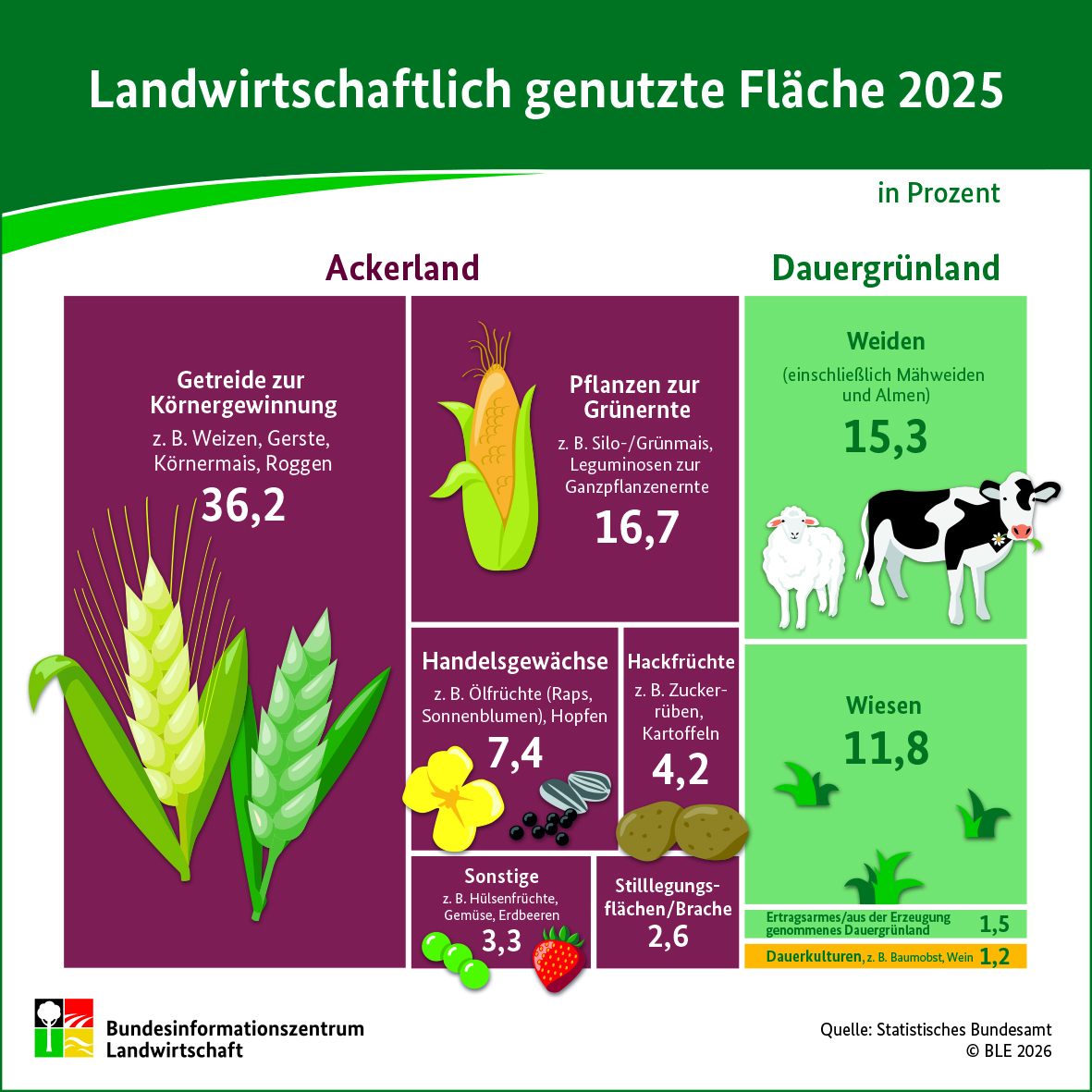 Die landwirtschaftliche Nutzfläche belief sich 2025 auf rund 16,6 Millionen Hektar. Das entspricht etwa der Hälfte der Bodenfläche Deutschlands. Die landwirtschaftlich genutzte Fläche lässt sich in drei Oberkategorien unterteilen: Ackerland, Dauergrünland und Dauerkulturen.