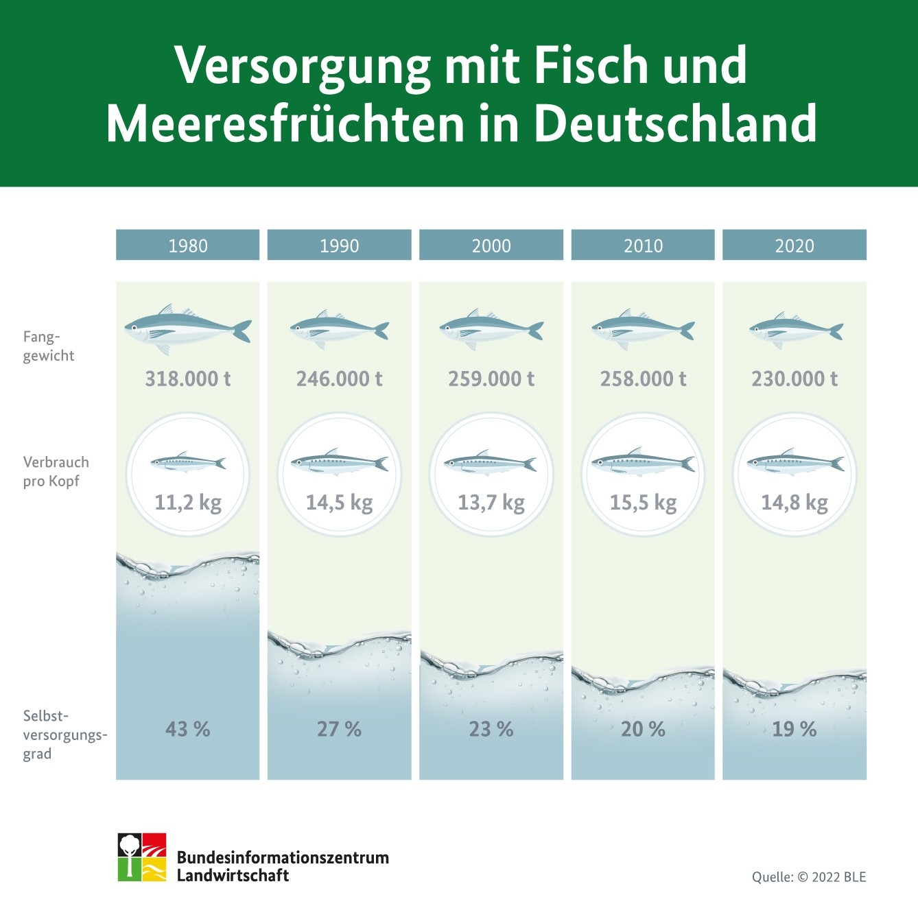 Der Pro-Kopf-Verbrauch ist 2020 im Vergleich zum Wert vor zehn Jahren leicht gesunken. Der Selbstversorgungsgrad weist über die Jahrzehnte einen rückläufigen Trend auf. Rund 80 Prozent der hierzulande verbrauchten Fischereierzeugnisse werden importiert.