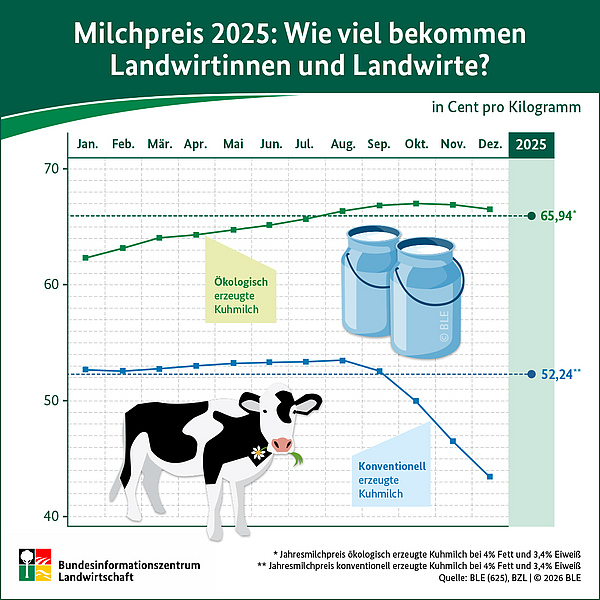 Umgekehrt ist es, wenn das Angebot größer ist als die Nachfrage. So hat zum Beispiel 2023 die Inflation in Kombination mit den steigenden Preisen im Bio-Bereich dazu geführt, dass weniger Bio-Milch nachgefragt wurde. Entsprechend sind die Erzeugerpreise für Bio-Milch gefallen.