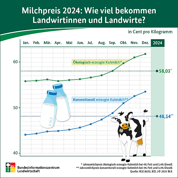 Ein Liter konventionelle Frischmilch kostete 2024 in deutschen Supermärkten vorläufigen Schätzungen zufolge durchschnittlich 1,02 Euro, ein Liter Bio-Milch 1,20 Euro. Laut dem Institut für Ernährung und Ernährungswirtschaft (ife), das jährlich die Kosten der Wertschöpfungskette Milch berechnet, bleiben von dem Geld, das Verbraucherinnen und Verbraucher an der Ladentheke für Milch bezahlen, rund 48 Prozent für die Landwirtinnen und Landwirte übrig (Stand 2022). Das ist der sogenannte Erzeugerpreis, den Molkereien den Milchbetrieben für die Rohmilch zahlen.