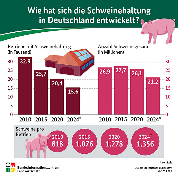 - Die Zahl der Schweinehaltungsbetriebe in Deutschland ist stark rückläufig; die Produktion konzentriert sich auf immer weniger und größere Höfe.